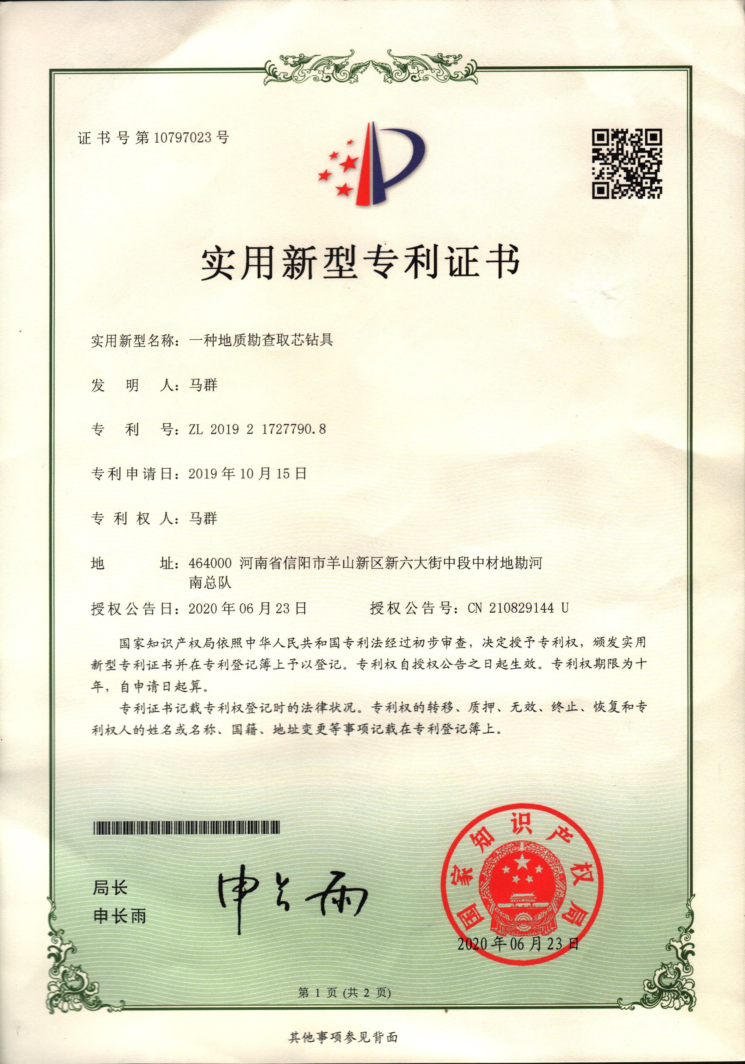 本實用新型涉及鉆探用具技術領域,且公開了一種地質勘查取芯鉆具,包括外套管、外鉆頭、安裝座,所述外套管的底端套接有外鉆頭,所述外套管的頂端與安裝座的底端連通,所述外套管的內壁與連接件公頭的外表面焊接,所述連接件公頭的頂部與連接件母頭的底部卡接,所述連接件母頭的內壁與內套管的外表面焊接。該地質勘查取芯鉆具,通過鎖緊件與內套管和內鉆頭的配合,使得地質勘查取芯鉆具在遇到較硬的地址時,鎖緊件中的緩沖件能夠對內鉆頭起到一定的緩沖作用,提高了地質勘查取芯鉆具的使用壽命,通過連接件公頭與連接件母頭的配合,使得內套管與外套管之間的連接較為方便,且外套管能夠帶動內套管和內鉆頭同步轉動。
