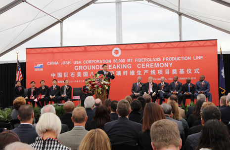 張毓強在致辭中講到,巨石美國項目的建設,是中國巨石繼埃及項目之后,為加快企業全球布局做出的又一項重大戰略決策。一期項目總投資3億美元,玻纖年產能8萬噸,本著工廠前移、研發前移、人才前引、就地生產、靠近客戶、貼近市場、以外供外的總體原則進行建設,計劃于2018年建成投產。項目將采用世界上最先進的環保技術,將努力實現經濟效益和社會效益的雙豐收。他表示,美國是玻璃纖維的發源地,也曾是全球最大的玻纖生產國和消費國,更是中國巨石最大的海外市場。美國玻纖工業專業化水平高、市場領域廣、各類資源豐富、發展前景樂觀,選擇在美國建廠,一方面說明了中國巨石實施“布局國際化、市場全球化”戰略,進一步融入國際市場的堅定信心,另一方面也證明了作為行業領軍者的中國巨石,已經具備了在全球任何國家建設世界一流玻纖生產線的實力和能力。