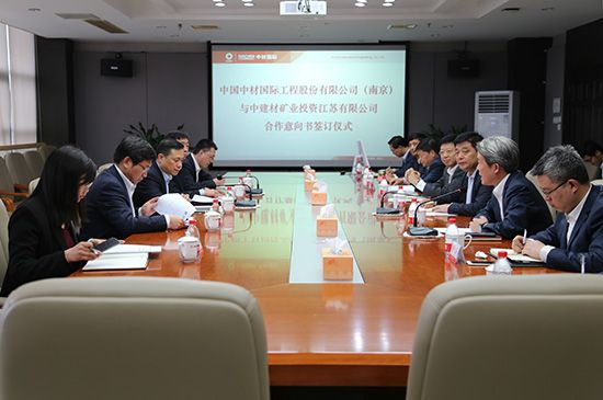 4月9日,中建材礦業(江蘇)與中材國際(南京)就尼日利亞及西非區域礦業合作事項在南京簽約。地勘中心主任吳巖、中材國際(南京)董事長沈軍參加儀式并見證簽約,中建材礦業(江蘇)董事長汪要武、中材國際(南京)副總裁潘闖分別代表雙方簽字。中材國際(南京)黨委副書記劉仁越主持簽約儀式。