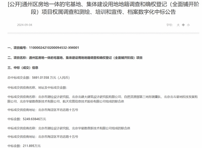 黨的二十大報告要求全面實施鄉村振興戰略,深化農村土地制度的改革,確保農民享有更加完整的財產權益。開展農村房地一體確權登記工作,是黨中央確定的重大惠民利民工程,是關系農村經濟社會發展的一項重要基礎性工作,事關維護和保障農民權益,是推動宅基地“三權分置”改革等工作的基礎。2023年8月,北京市全面啟動該項工作,測繪院(華星公司)充分發揮在北京市不動產測繪領域的技術優勢和市場積淀,積極參與北京市房地一體地籍調查確權登記工作。2024年9月,與北京市測繪設計研究院等6家單位組成的聯合體成功中標通州區房地一體的宅基地、集體建設用地地籍調查和確權登記項目,其中測繪院(華星公司)中標金額超1500萬元。該項目是測繪院(華星公司)成立以來承接的合同金額最大的單項合同,創造了測繪院(華星公司)市場經營新記錄,為公司完成全年經營指標和實現“十四五”規劃目標奠定了堅實的基礎。隨后,測繪院(華星公司)又中標了朝陽區房地一體的宅基地、集體建設用地地籍調查和確權登記項目。