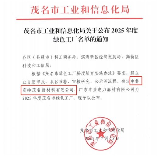 近日,茂名市工業和信息化局發布了《關于公布2025年度綠色工廠名單的通知》,中非高嶺茂名新材料有限公司(以下簡稱“公司”)憑借過硬的綜合實力、綠色先進的加工技術和綠色低碳產品優勢,經自主申報、縣區推薦、審核研究等流程,通過層層篩選,成功獲評“2025年度茂名市綠色工廠”。