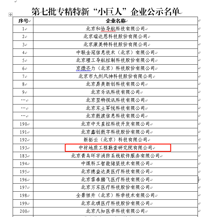 近日,國家工業(yè)和信息化部公布第七批國家級專精特新“小巨人”企業(yè)名單,中材地質(zhì)工程勘查研究院有限公司成功入選。這是地勘院在北京市科技研發(fā)機構和企業(yè)技術中心等多個省級研發(fā)平臺的基礎上,首次獲得國家級認證的創(chuàng)新平臺,是各業(yè)務板塊科技創(chuàng)新的重要成果,標志著地勘院在專業(yè)化、精細化、特色化、新穎化發(fā)展道路上取得了里程碑的進步。