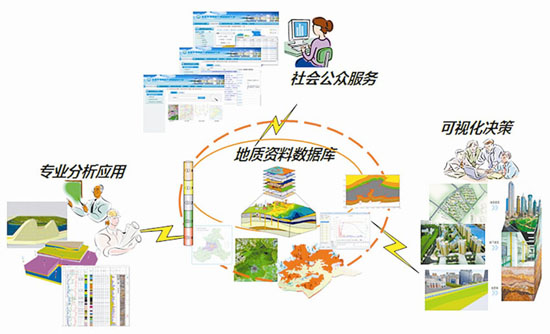 如何把那些零散的、各部門各自所有的地質(zhì)資料統(tǒng)一歸納起來,實(shí)現(xiàn)地質(zhì)資料的共享,促進(jìn)各個(gè)城市的地質(zhì)工作順利開展?解決這一問題,需要建一個(gè)平臺(tái),將城市地質(zhì)調(diào)查產(chǎn)生的地質(zhì)資料和成果收集、處理、檢查入庫,形成多源、異構(gòu)、海量的地質(zhì)“數(shù)據(jù)中心”。同時(shí),綜合利用GIS、三維、數(shù)據(jù)庫等技術(shù),建成面向?qū)I(yè)研究的基礎(chǔ)工作平臺(tái)、面向政府規(guī)劃管理的三維可視化決策支持平臺(tái)、面向社會(huì)公眾的地質(zhì)信息共享服務(wù)平臺(tái)。