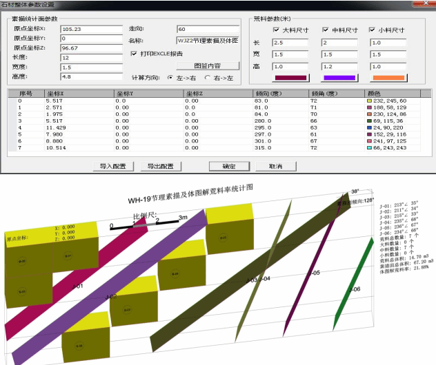 飾面石材體圖解荒料率統計三維建模軟件是由中國建筑材料工業地質勘查中心湖北總隊自主研發的一款適用于飾面石材勘查及荒料生產模擬的專業軟件,軟件依托飾面石材勘查規范中體圖解荒料率疊合法的數學原理進行開發。使用軟件后,在體圖解荒料率統計制圖環節,提高了成圖效率,制圖質量及直觀性有了質的提高;同時軟件支持石材礦山企業實際開采過程中的軌道布設及切割方向模擬功能,能為荒料切割開采提供生產指導,提高石材生產的實際荒料率和企業生產效益并減少廢料等固廢的產生,社會和經濟效益顯著。軟件已獲得軟件著作權登記(登記號:2021SR1489934),該軟件面向飾面石材勘查企事業單位及石材開采企業,現已成功應用于多家單位的多個石材勘查項目中,是一項先進的三維成圖分析技術,同時也是一種綠色勘查技術。