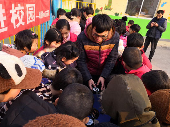 校園里,項目組成員王言偉、劉曉克、孫越琦運用所學知識,寓教于樂,從學生身邊的實物出發,對學生進行地質科普的講解,述說地質工作的內容、巖石標本和羅盤的運用,激發了學生們的參觀熱情,大家紛紛走上前去認真觀看,不時交流討論,現場氣氛熱烈。