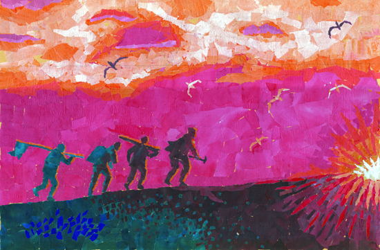十九大前夕,李運正將精心創作的,反映建材地質工作者野外一線工作場景的七幅撕紙畫送到總隊黨委,表達了自己的美好祝愿。這七幅撕紙畫的主題分別是《迎著朝霞》、《選點》、《測繪》、《找礦》、《提鉆》、《地形點》、《巖心分析》。作品古樸大氣、意境高遠,謳歌了我們建材地質工作者為了祖國的建設事業,跋山涉水努力工作的精神風貌。