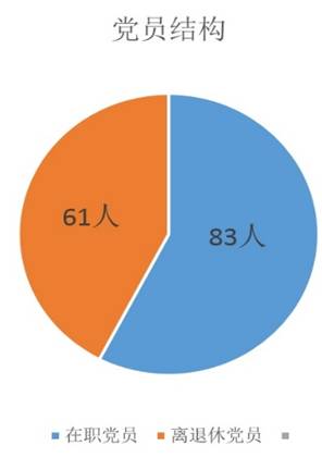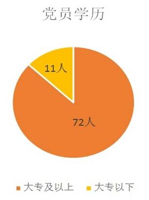 總隊(duì)黨委現(xiàn)有五個(gè)基層黨支部,黨員共144人。其中,機(jī)關(guān)支部28人,于2015年10月完成換屆;學(xué)校支部12人,于2015年10月完成換屆;離退休支部61人,于2015年11月完成換屆;野外支部31人,于2015年12月完成換屆;2016年6月新成立中心支部黨員12名。黨員結(jié)構(gòu)及學(xué)歷如下圖: