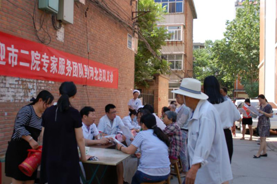 義診活動在總隊家屬院舉行,保定市第二醫院共派出血管外科、心血管內科、心胸外科、眼科、骨科、醫療保健科等八位專家前來義診。