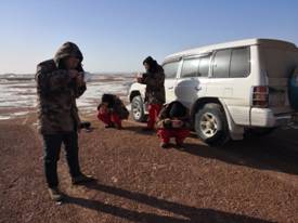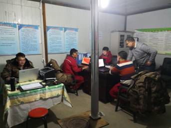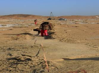 下午六點,寒風強勁,氣溫驟降,夜幕低垂。大家收拾裝備回到車上,開始返回駐地。凍了一天的我們突然覺得四處漏風的車是那么溫暖,顛簸的道路就像兒時的搖籃,勞累一天的我們就慢慢在車上睡著了。晚上七點多,星光璀璨,月華初上,我們安全到達駐地。大家回去立馬給兩個大水桶蓋上被子,再在桶邊生上火,保護我們的生命之源。吃完飯后,大家各自打開那一天就落滿灰塵的電腦,立馬開始整理當天的原始資料。晚上十二點左右,大家整理完資料,檢查歸類以后,項目負責開會安排明天的工作。接著安全員每晚去每個屋子提醒大家晚上開窗留縫,小心煤煙中毒。完成一天的工作,大家頓時輕松了,時不時講個笑話,帶著爽朗的笑聲,拖著疲憊的身軀,酣然入睡。戈壁灘的夜是寂靜的,靜得使窗外的風都顯得那么囂張,狂風伴著人們的呼吸聲奏著冬日的狂歡曲。