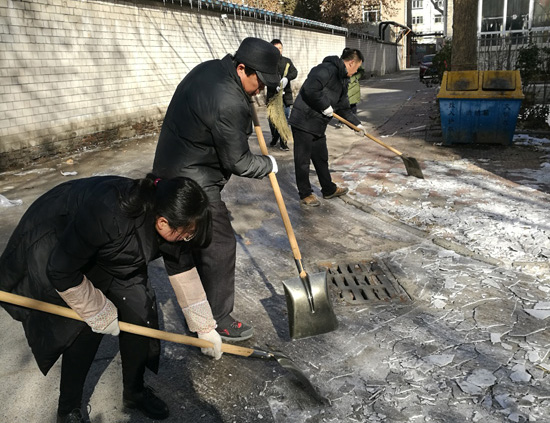 志愿者不畏寒風凜冽,用掃帚、鐵鍬,一點點地掃,一锨锨地鏟,經過三個多小時的奮戰,將總隊家屬院道路、單元門口的積雪全部鏟除,開辟出一條溫暖之路。