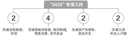 “2422”專項工作中,“2”指壓減應收賬款、存貨,“4”指壓減其他應收款、預付賬款、帶息負債、貨幣資金,“2”指壓減資產負債率、資本開支,“2”指壓減冗員、法人戶數。深入實施“2422”專項工作,可全面提升企業運行質量,真正實現瘦身健體、提質增效。