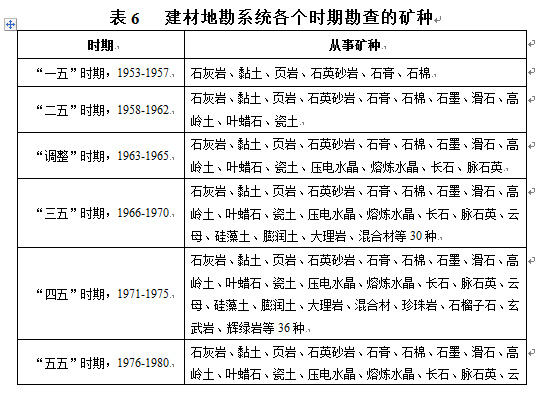 自1953年建材地勘隊伍創建以來的各階段、各不同時期,建材地勘系統勘查的礦種是不同的,而且隨著時間的推移,勘查的礦種不斷增多,勘查隊伍也不斷擴大、裝備不斷更新、成果不斷增多,貢獻不斷增大。