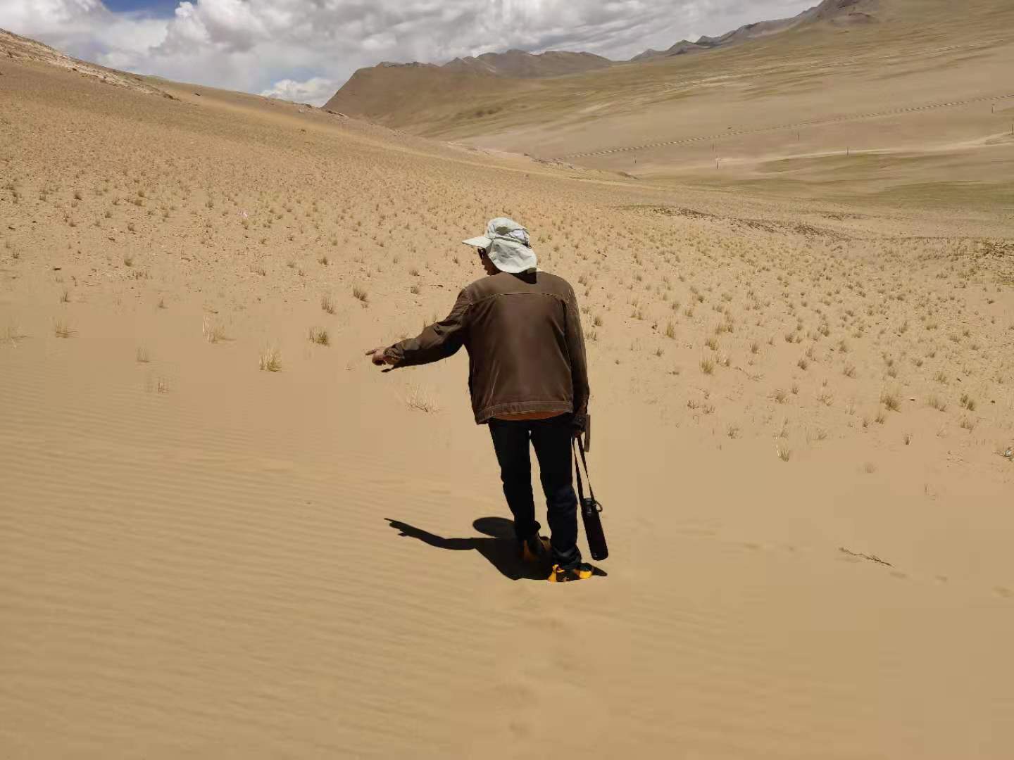 西藏分院院長帶領項目組人員在仲巴縣帕羊鎮捏莫拉石灰石一般工作區進行踏勘工作,工作區海拔4700~5200m,工作區基本處于無人區,無車路可通行,無信號;項目組人員頂著烈日,穿行在小沙漠中,困難前行,每天僅穿越路線3.0~5.0km。